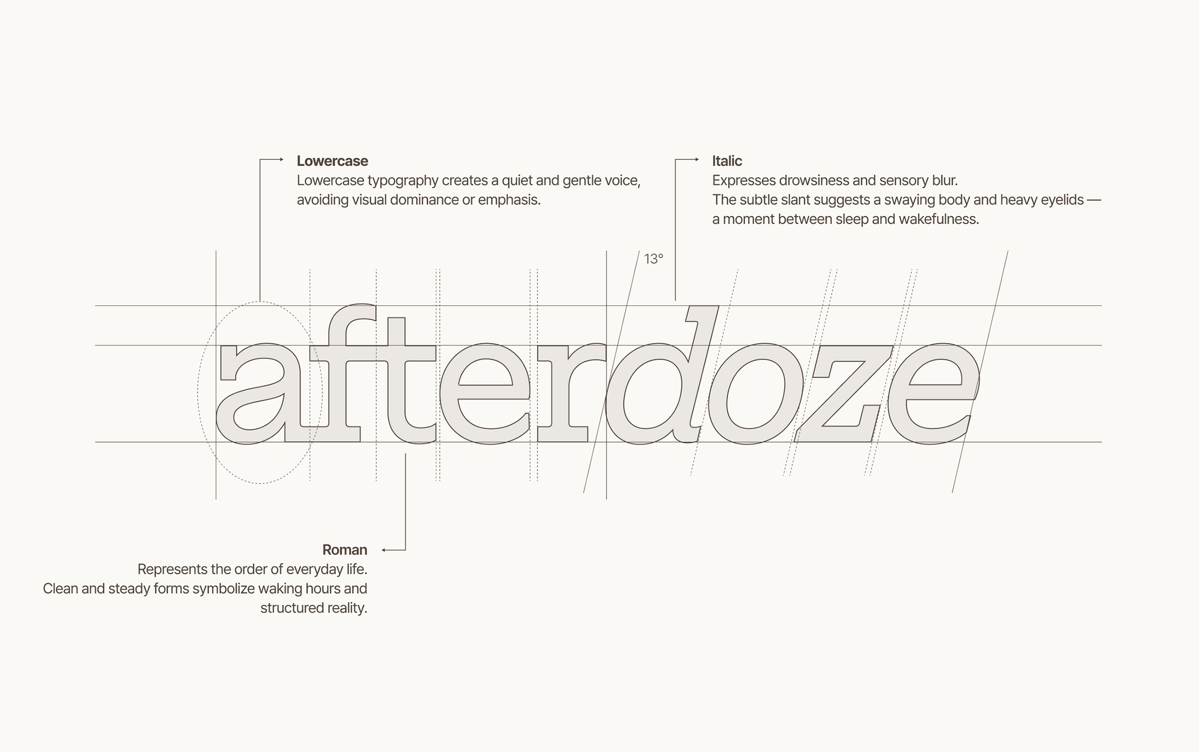 The lowercase typography creates a quiet, gentle voice. The contrast between Italic and Roman styles reflects the dual rhythm of the brand: the subtle slant suggests the blur of sleep, while the steady forms evoke the structure of waking life.