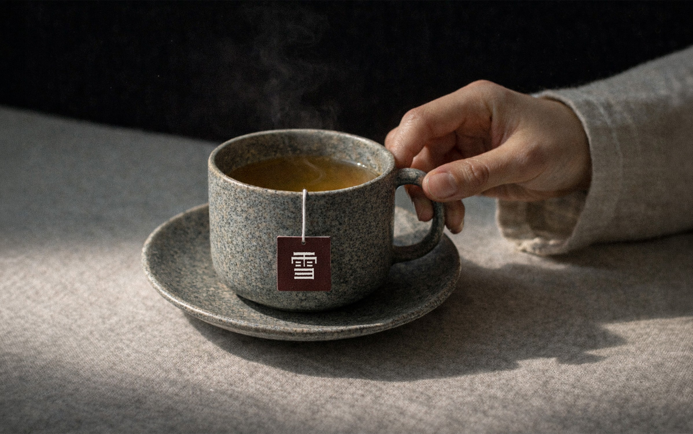 The symbol is derived from the character ‘雪’, with weighted horizontal strokes suggesting the quiet accumulation of snow. The wordmark features expanded letter spacing to create a static rhythm, while the separated structure references the slow infusion of tea over time.