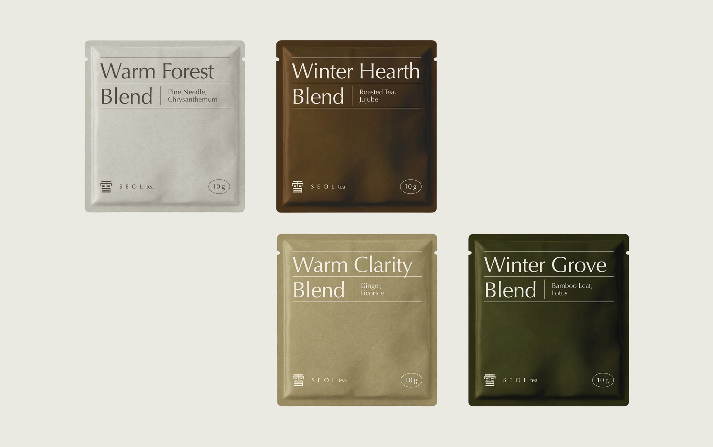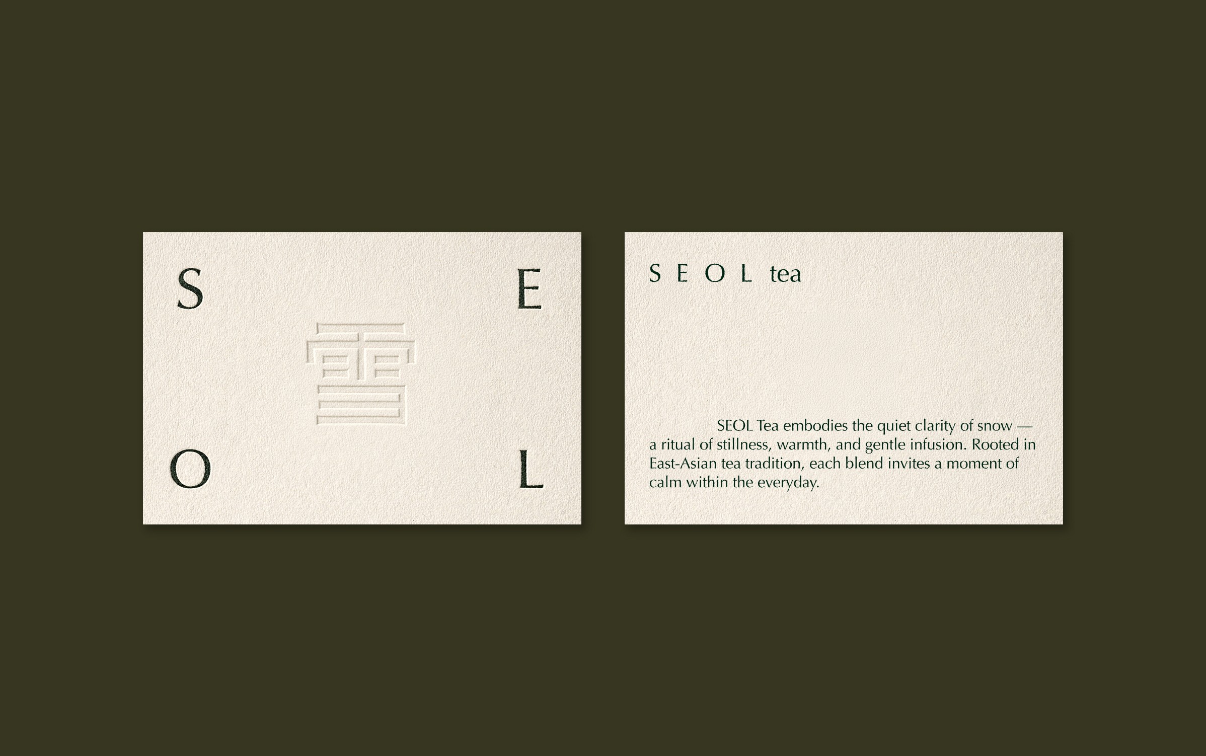 Inspired by the hanja ‘雪’ (snow), SEOL reinterprets the act of drinking tea as a quiet, daily ritual. The brand embodies clarity and restraint, translating the purity of snow into a moment of pause and purification.