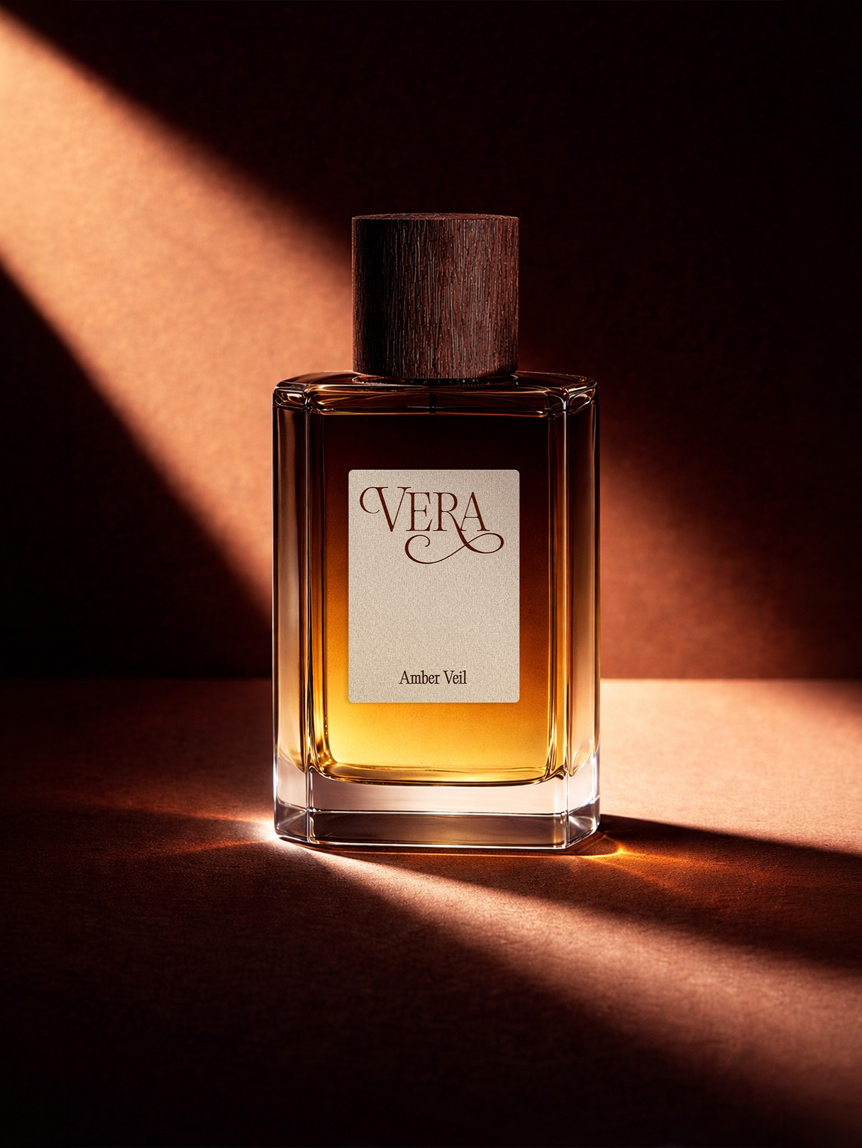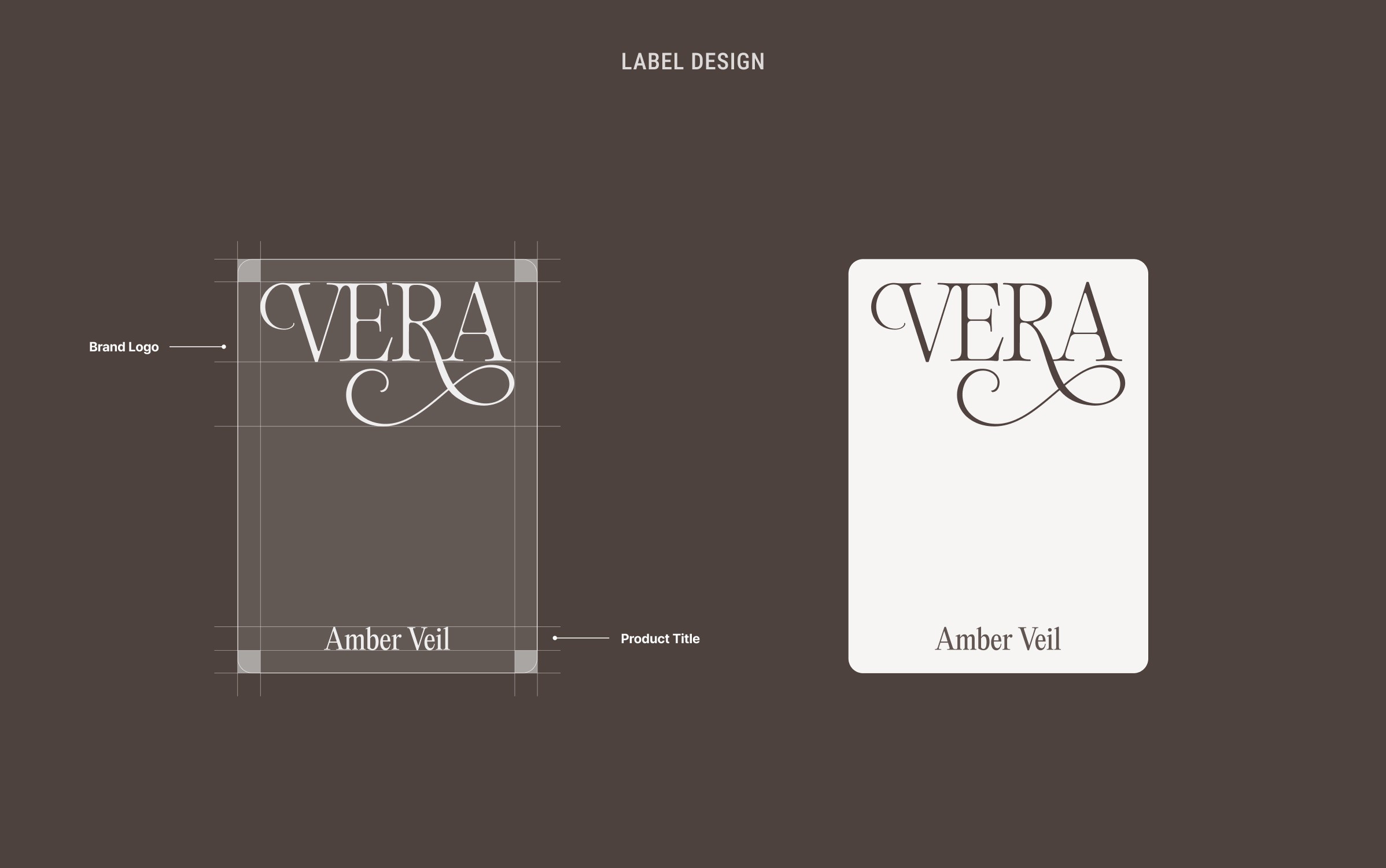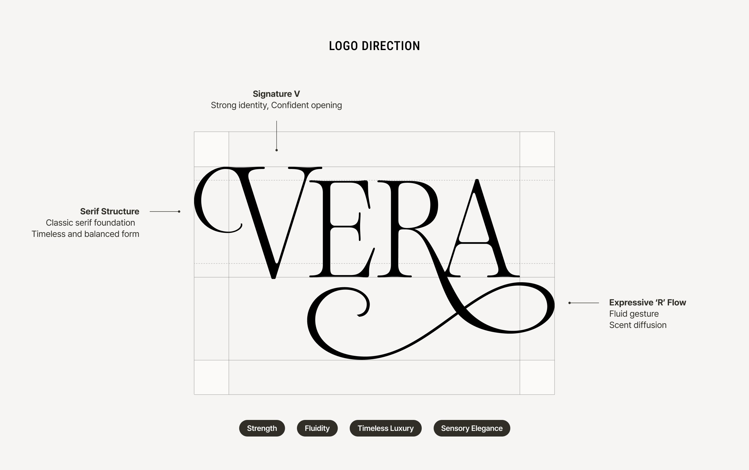 The Vera wordmark balances structural clarity with sensual movement. A sharp serif foundation gives the identity confidence and timelessness, while the expressive curve of the signature “V” introduces softness, fluidity, and scent-like diffusion. The label system extends this direction through a restrained and elegant composition.