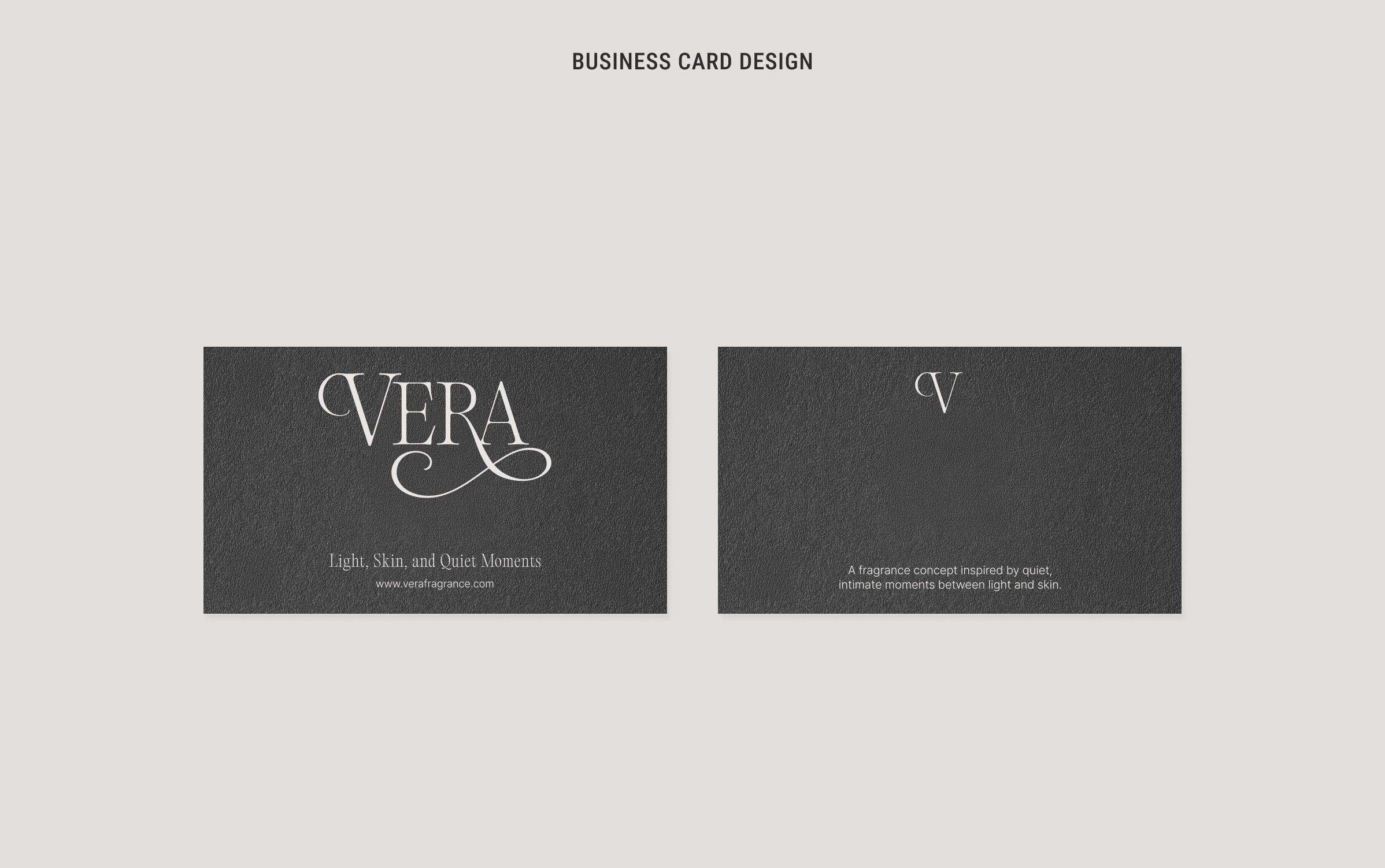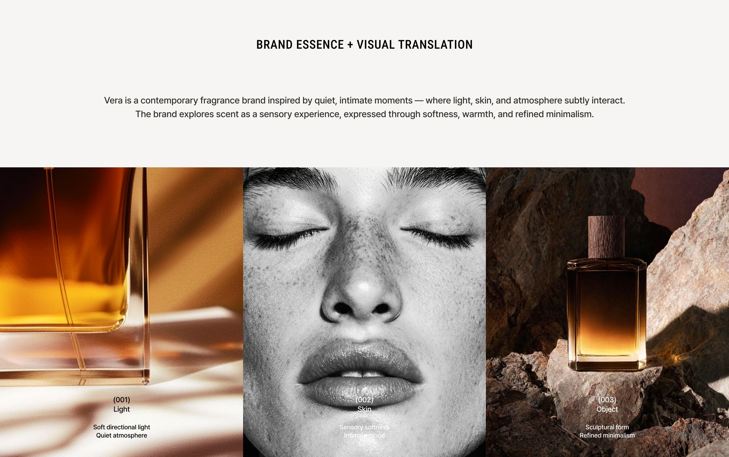 Vera is a conceptual fragrance brand built around light, skin, and quiet moments. The identity explores fragrance as atmosphere — subtle, intimate, and sensorial. Rather than relying on overt luxury codes, the brand is expressed through restraint, softness, and tactile elegance.